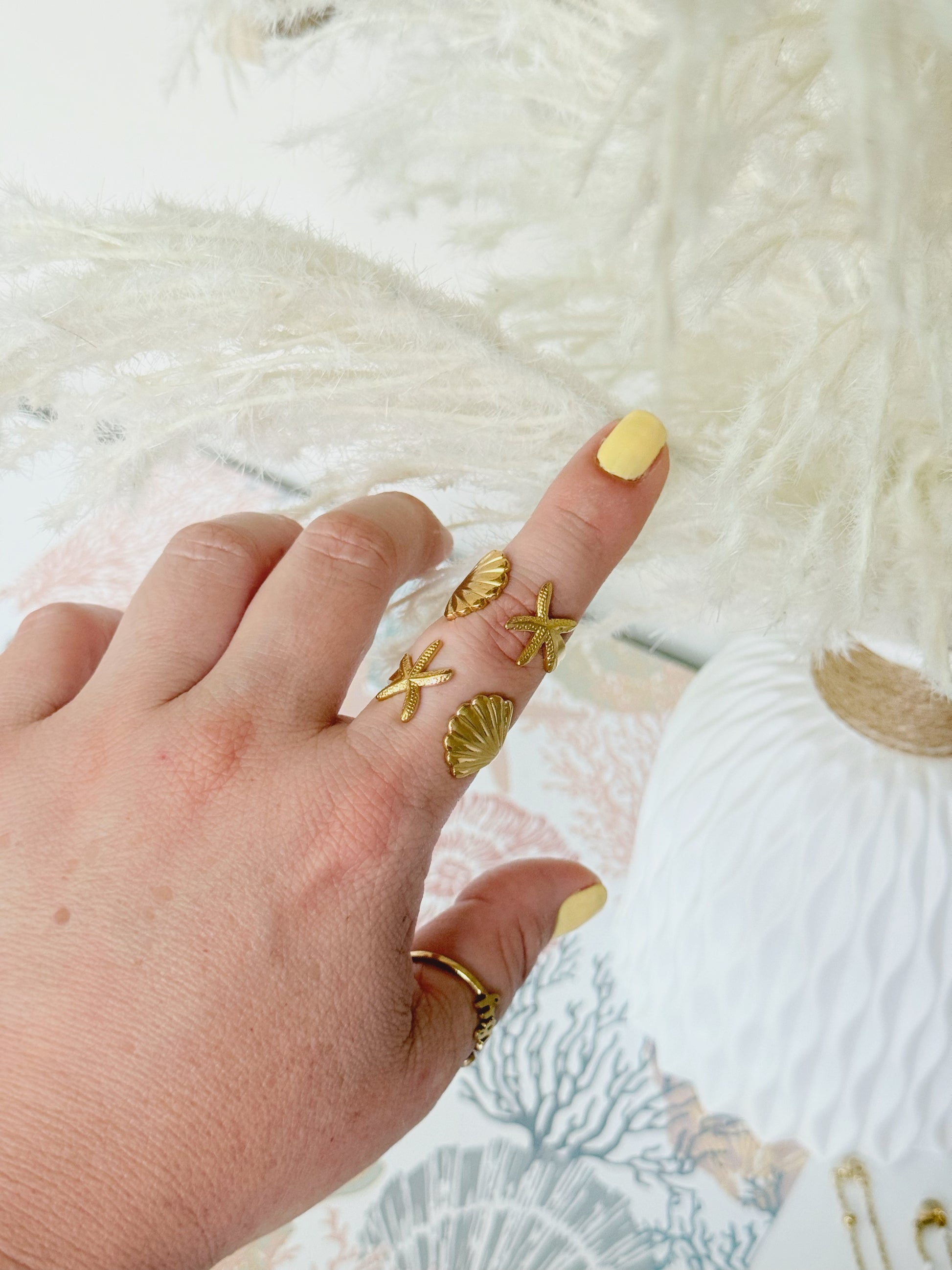 *Anillo con detalle de concha y estrella de mar en gold plate 18k